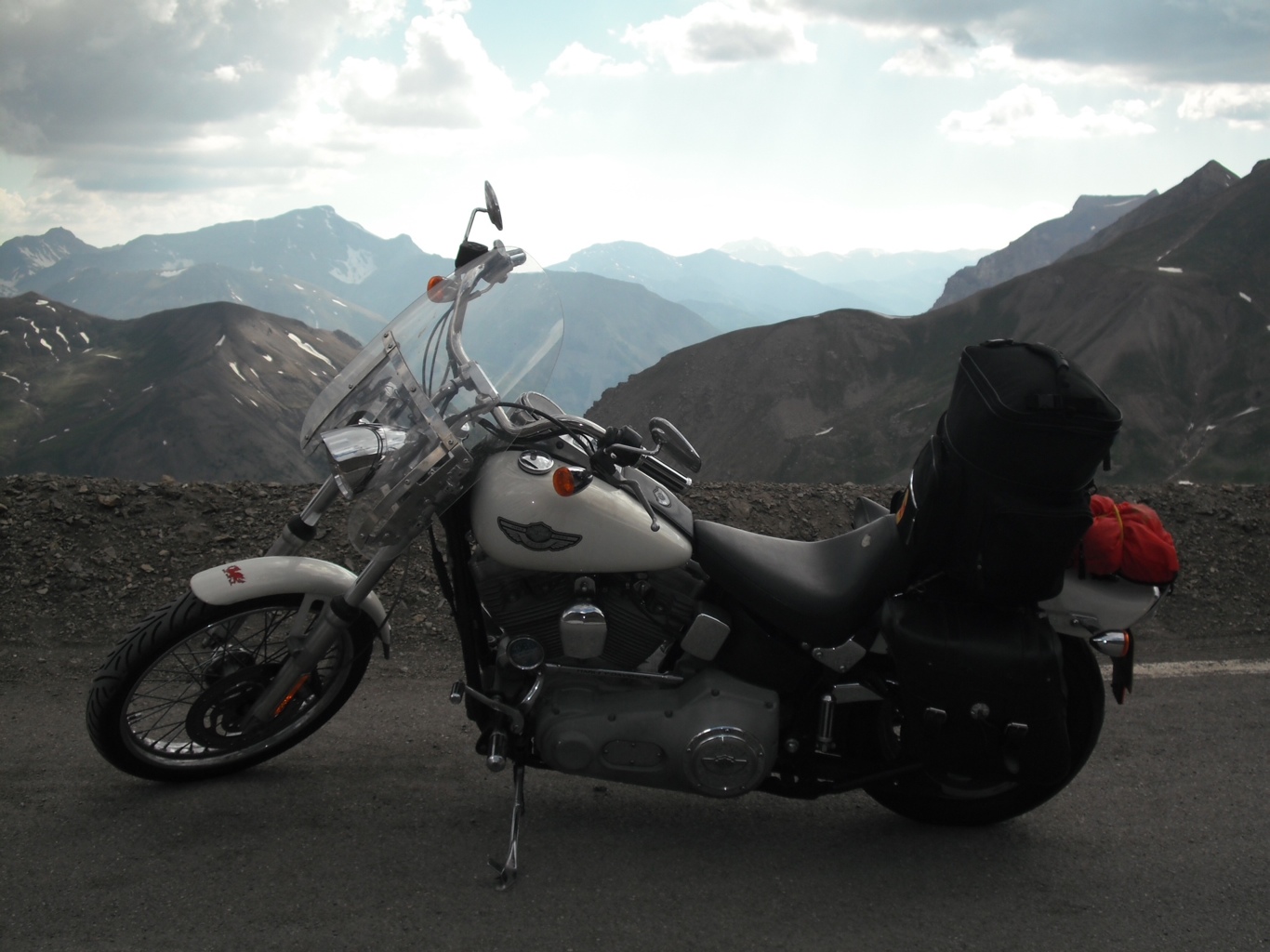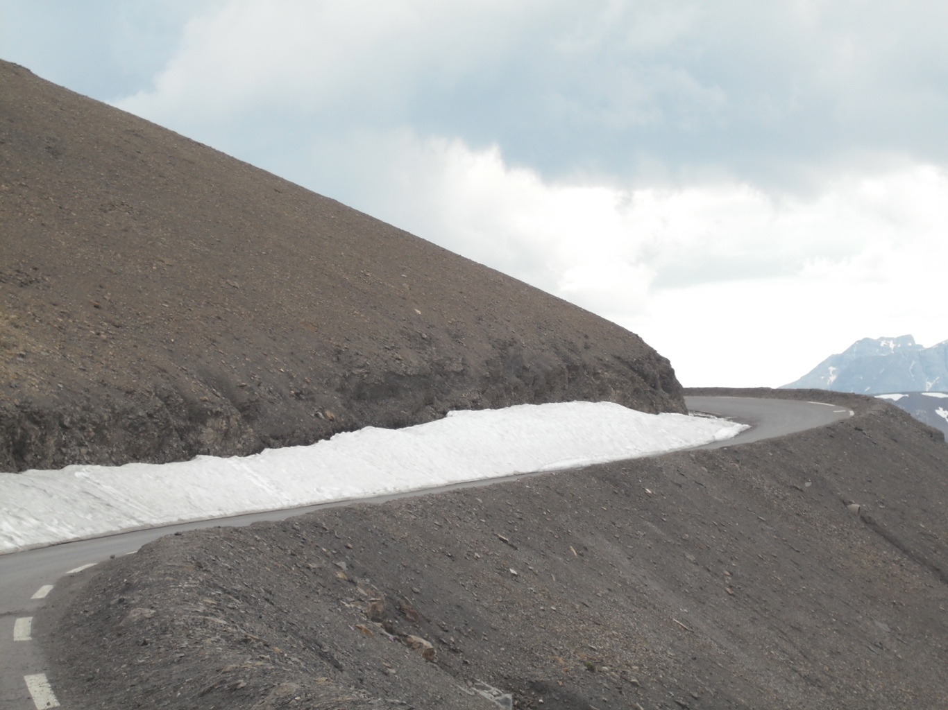 The road from Jausiers really kicks you in the pants from the start, as the hairpins start before you pass the town limit sign. The surface all the way to the summit is fantastic, in places nice and wide, in others a bit tight but ok. It’s about 15 miles to the top and takes about half an hour or so. There are some sweet straight bits, but just about every type of bend/curve/corner you could wish for and some that you wish were not! It was bloody hard work on Harley, not really the bike for this kind of road or altitude, she only has a carburettor and was desperately trying to gulp in the thin air long before the top, where she was surprisingly like an old Honda CB500!
