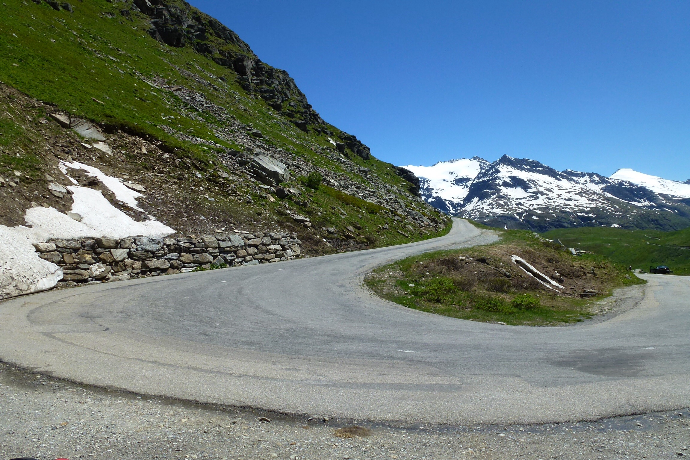 After surviving the divine madness that is Col de Mont Cenis and descending into the Lanslebourg valley, I turned Harley’s front wheel right and headed for the daddy of them all, Col De L’Iseran. At 2,770 metres (9,088 ft)) this is the highest paved pass in the Alps, it beats Stelvio by 13 metres, size does matter! It is situated in the department of Savoie and is crossed by the Wonderful D902. The pass is part of the Route des Grandes Alpes. It connects the valley of the Isère (Tarentaise) and the valley of the Arc River (Maurienne) between Val-d’Isère in the north and Bonneval-sur-Arc in the south.