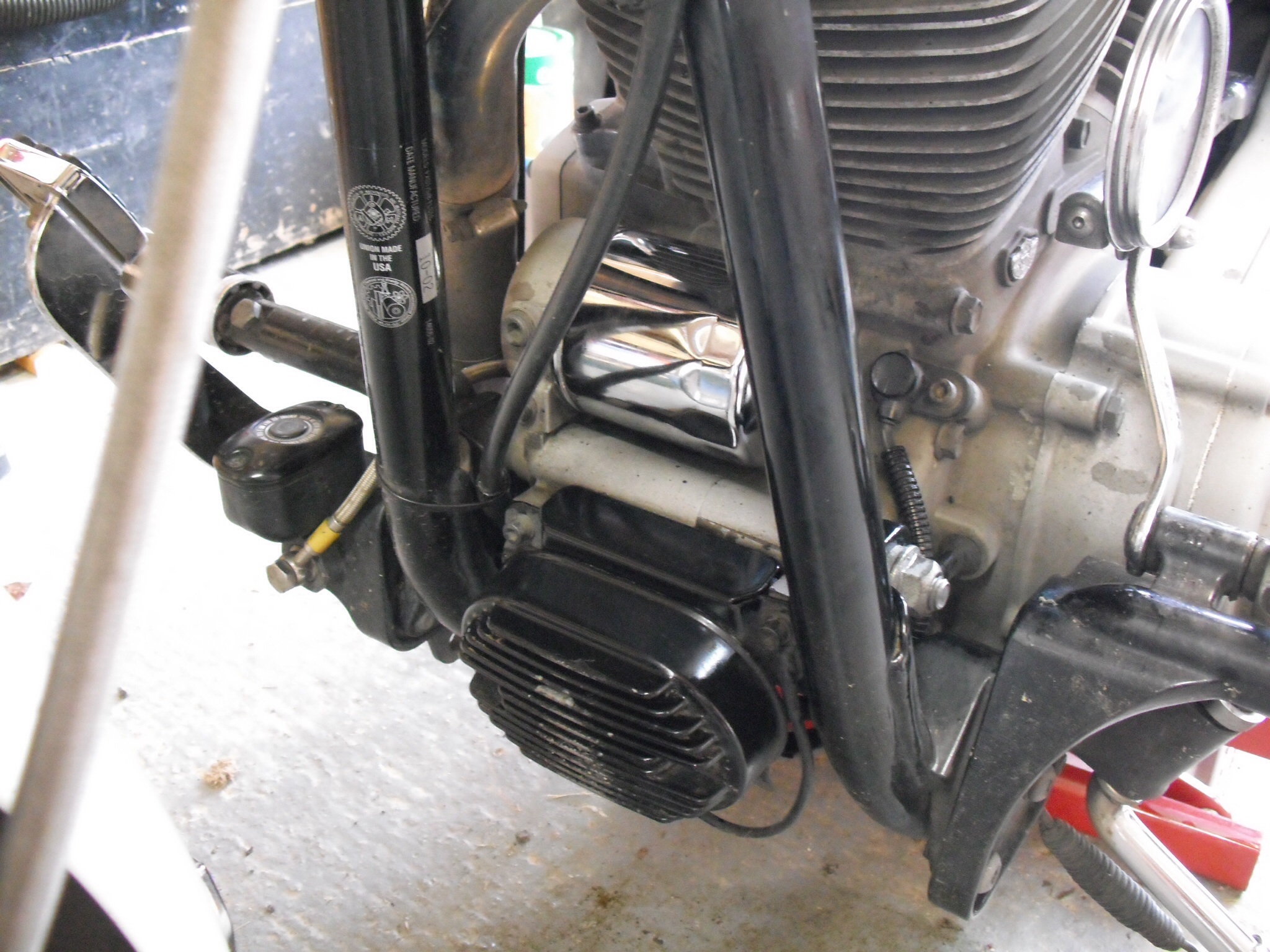 I said I needed some bits, actually I wanted to give Harley an oil change as we have been racking up the old mileage since the service in Spring. It has been said that oil is cheap, but engines ain’t, and I certainly buy into that sentiment! This afternoon I jacked Harley up on the workshop stand and set to work. It’s not a difficult job, nor, if you get it right, very messy…except for removing the old oil filter which is as messy as it gets, cos H-D designed the thing to lay on its side and when you unscrew it at least half of it’s contents of old oil have got to run out, it’s a gravity thing! This what it looks like when the filter is off.