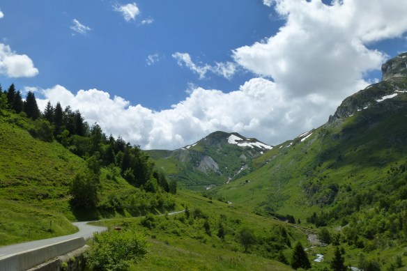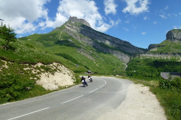 The slope gets steeper yet the road stays straight until we pass the hamlet of Le Laus where the turns begin. For the next five kilometres we enjoy some of the most delightful twisty roads that I have ever ridden anywhere. The high forest closes in on us as we tackle sweeping corners and ramps up to 20%, this road is tough, very tough. Previously here I’ve seen vehicles on their roofs in the woods and once one on fire, melting the tarmac as it blazed!