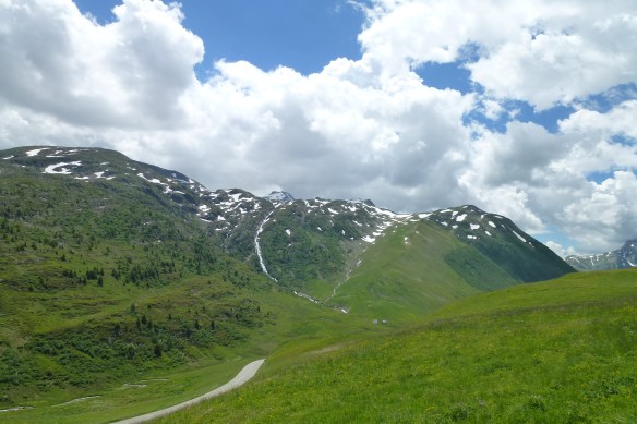 The Col is busy; lots of people are enjoying the gloriously hot weather. It’s a cosmopolitan mix of bikers, cyclists, car-drivers and even motor home tourists; I can hear at least eight different European languages being spoken. It feels nice, everyone is relaxed and happy, there’s a lot of smiling going on.